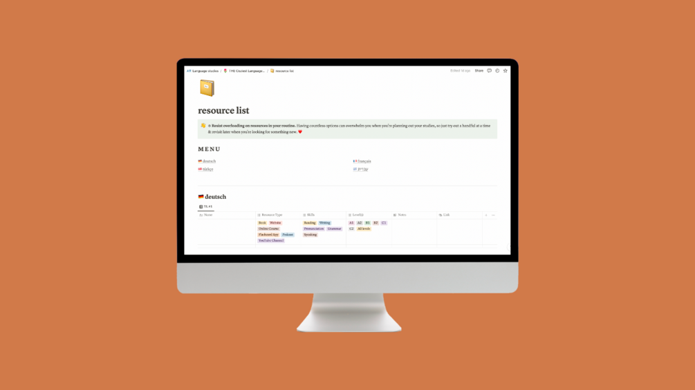 • a resource list template to categorize and store your language learning resources