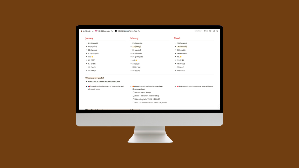 THE 2024 Language Plan-&-Track is hosted on Notion and includes the following: