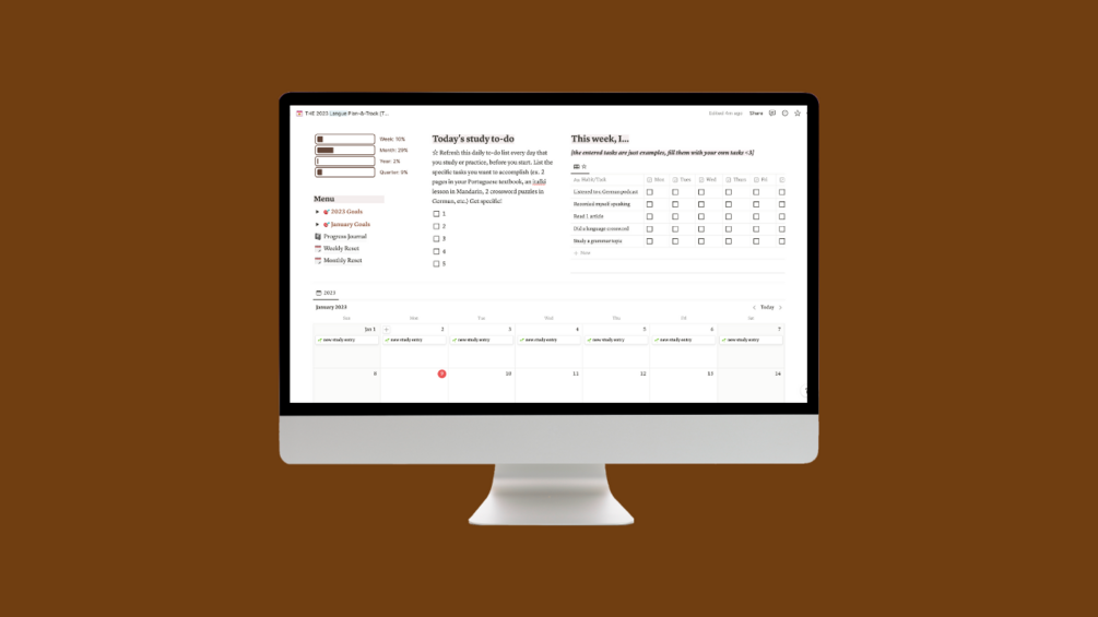 - a monthly calendar to log your studies (what language, how much time, activities completed)
